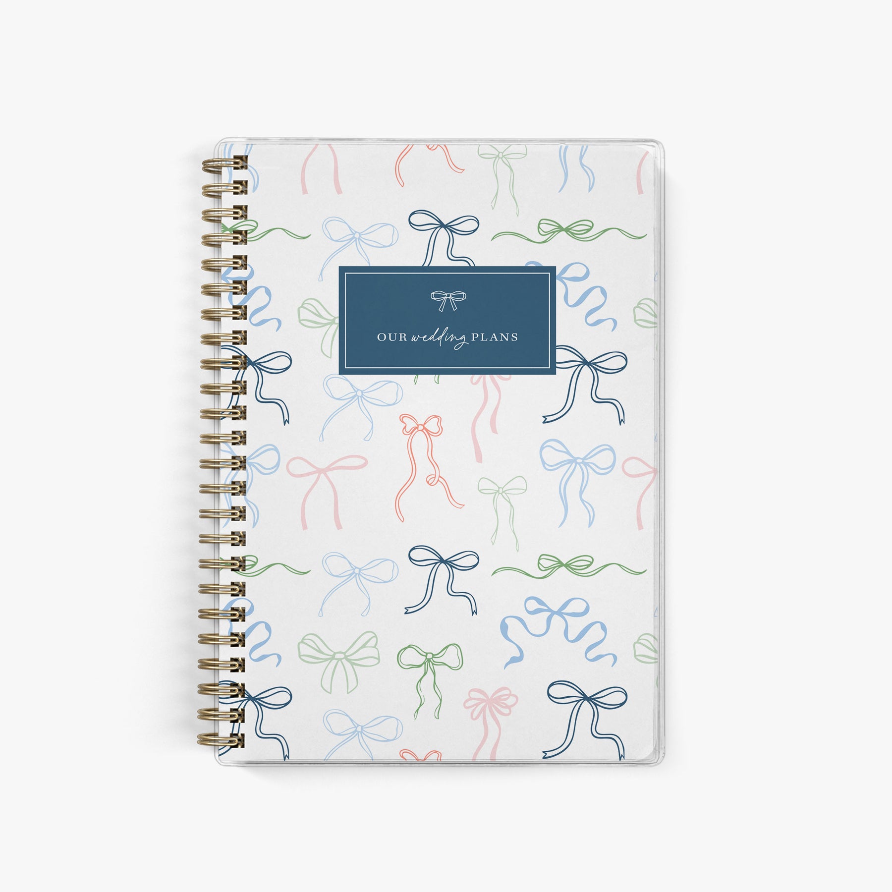 This personalized elopement planner features a charming and darling bow design. Sweet ribbons of blue, green and pink add a touch of whimsy to your micro wedding, pop-up ceremony, or as a thoughtful gift for the bride-to-be.