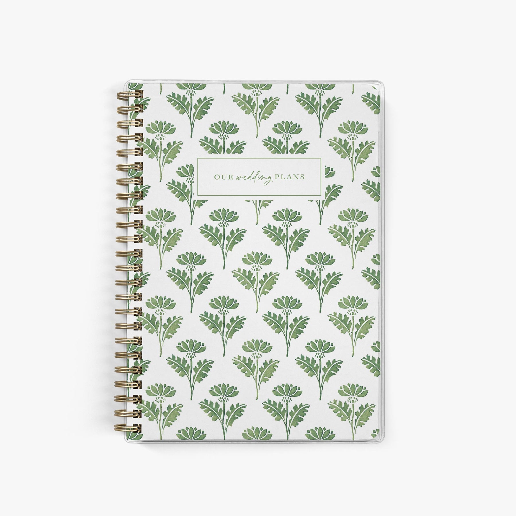 Soft sage green elopement planner with vintage-inspired green and white block print floral cover for classic, botanical wedding planning