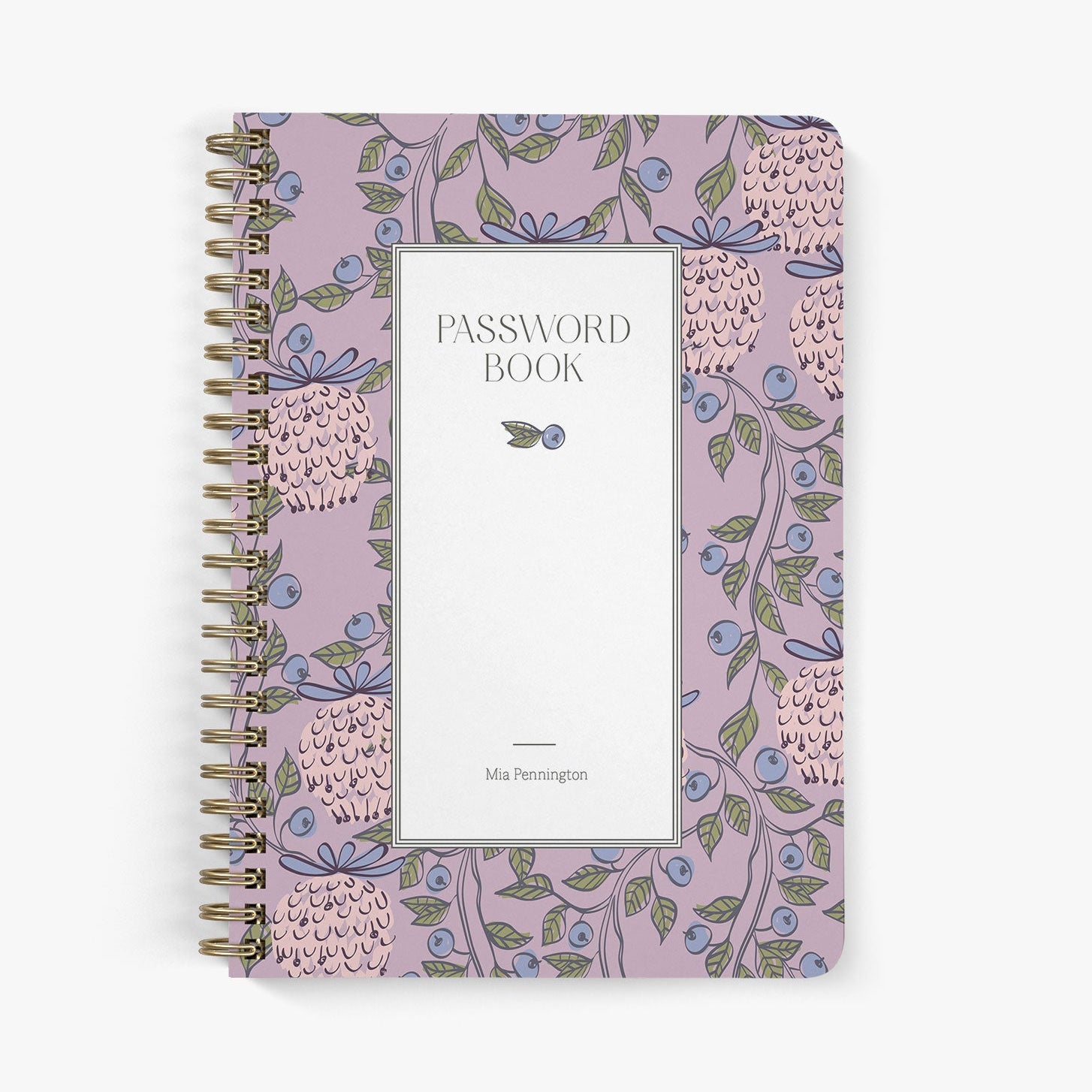 Back view of personalized password notebook with whimsical berry garden design bound with gold wire