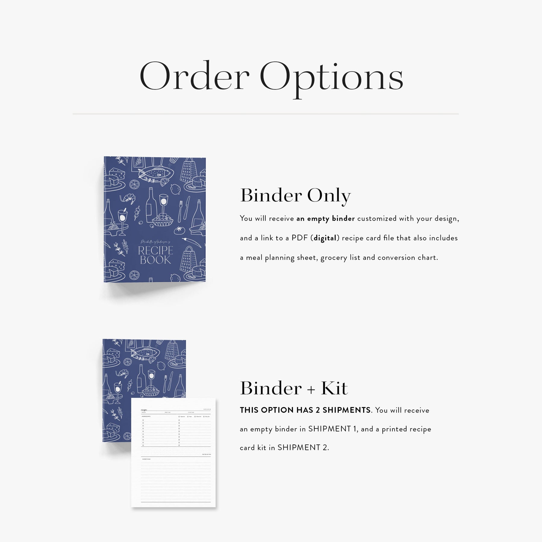 Our custom recipe binders come in two options; as an empty binder with digital recipe card set or with a printed recipe kit