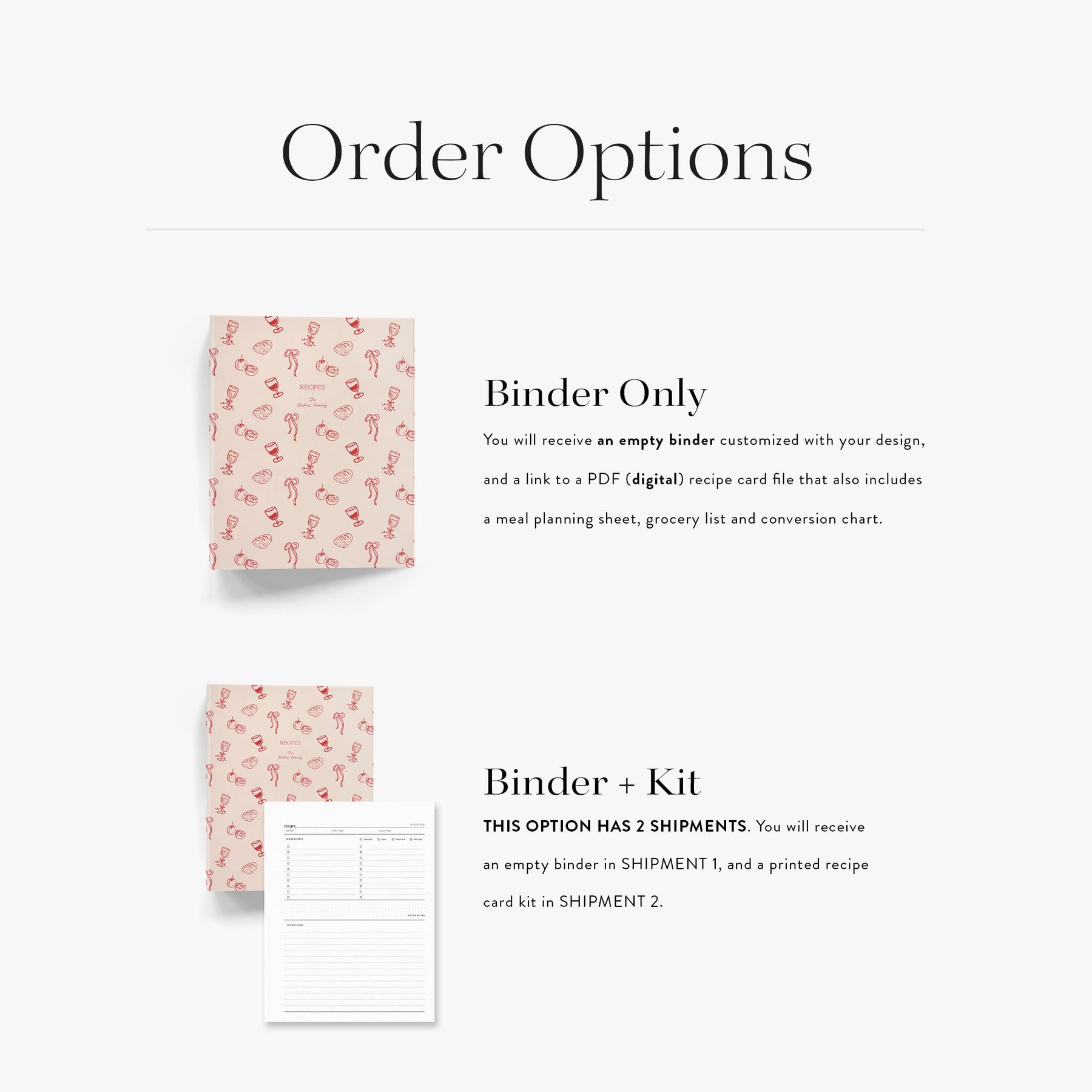 You will receive an EMPTY binder, and a link to the digital PDF recipe cards via email.