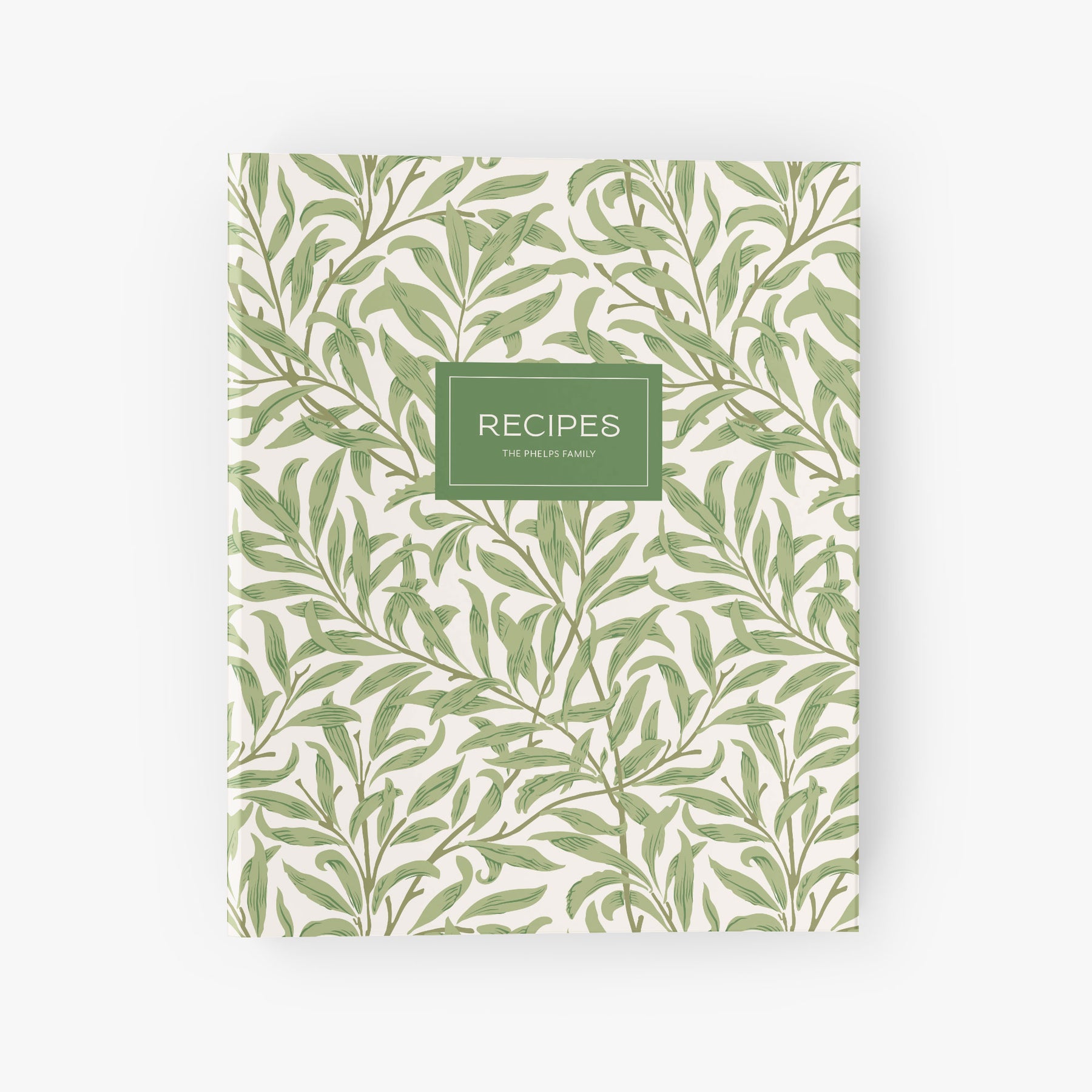 Personalized recipe binder with a green willow leaf pattern inspired by William Morris customized with your family name