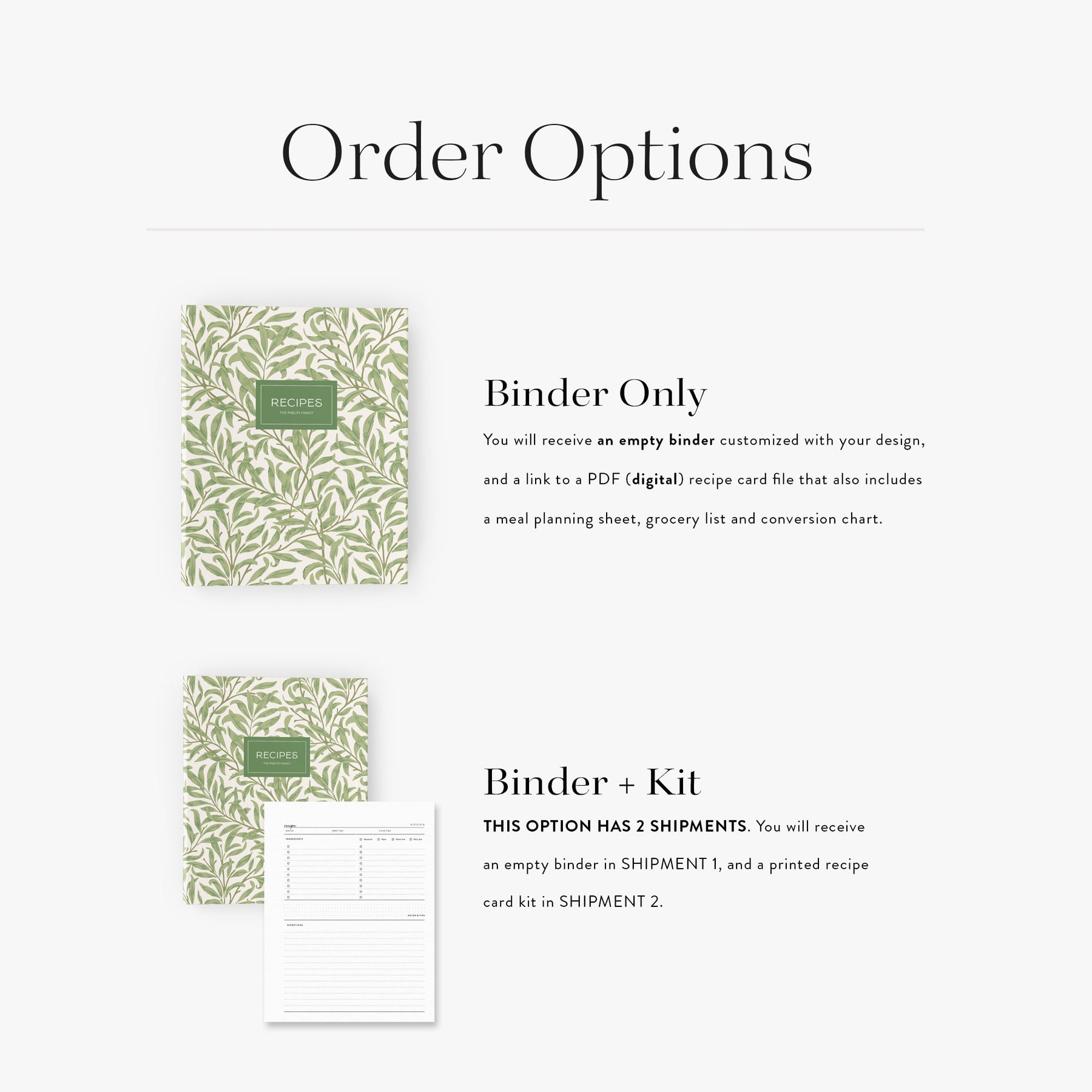 Stay organized in the kitchen with our custom recipe binder featuring an elegant willow leaf pattern with an art deco vibe. Each binder is personalized with your name and includes a digital PDF recipe kit you can print and reprint at home - perfect for creating your own keepsake cookbook.
