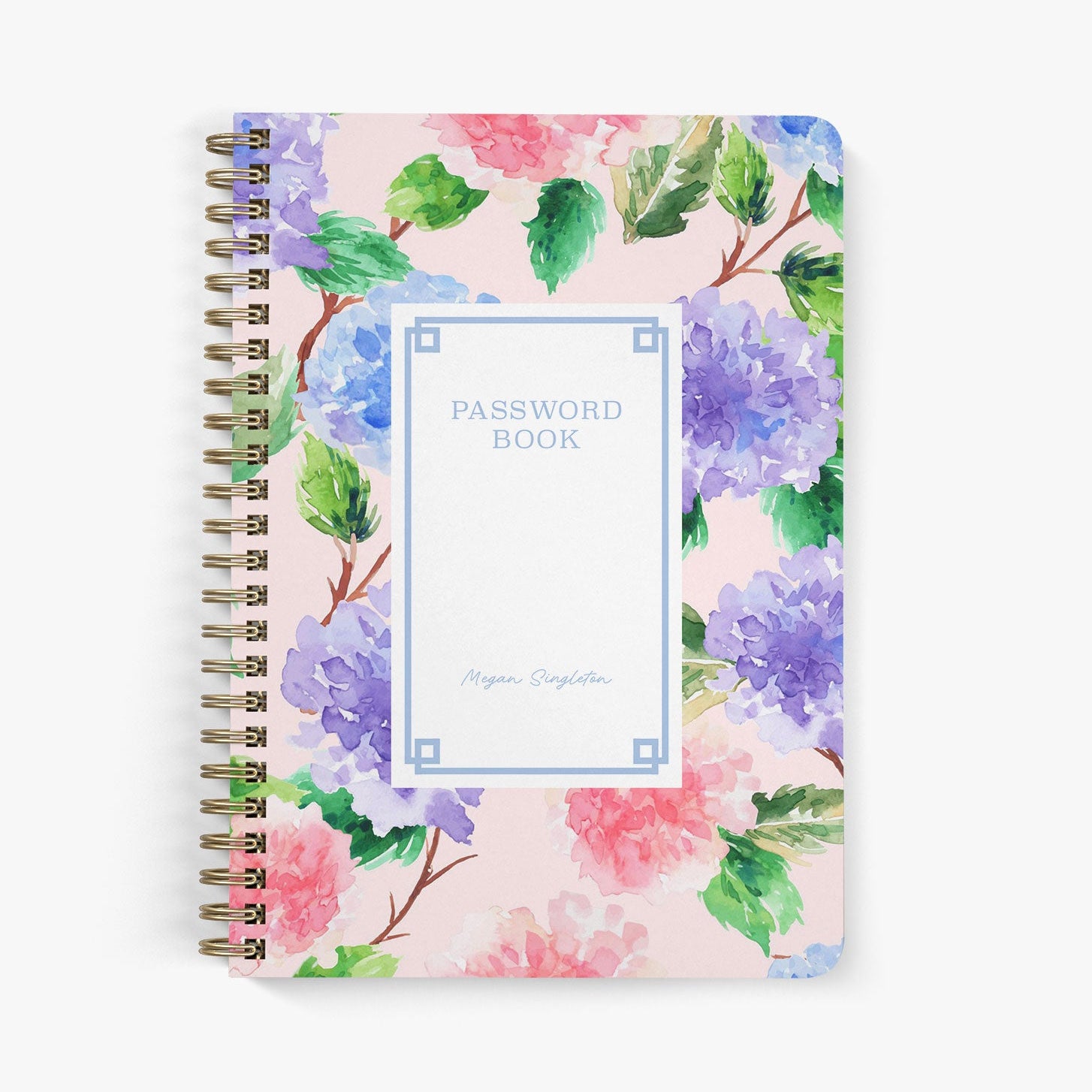 Custom password book featuring a colorful watercolor hydrangea pattern with gold binding