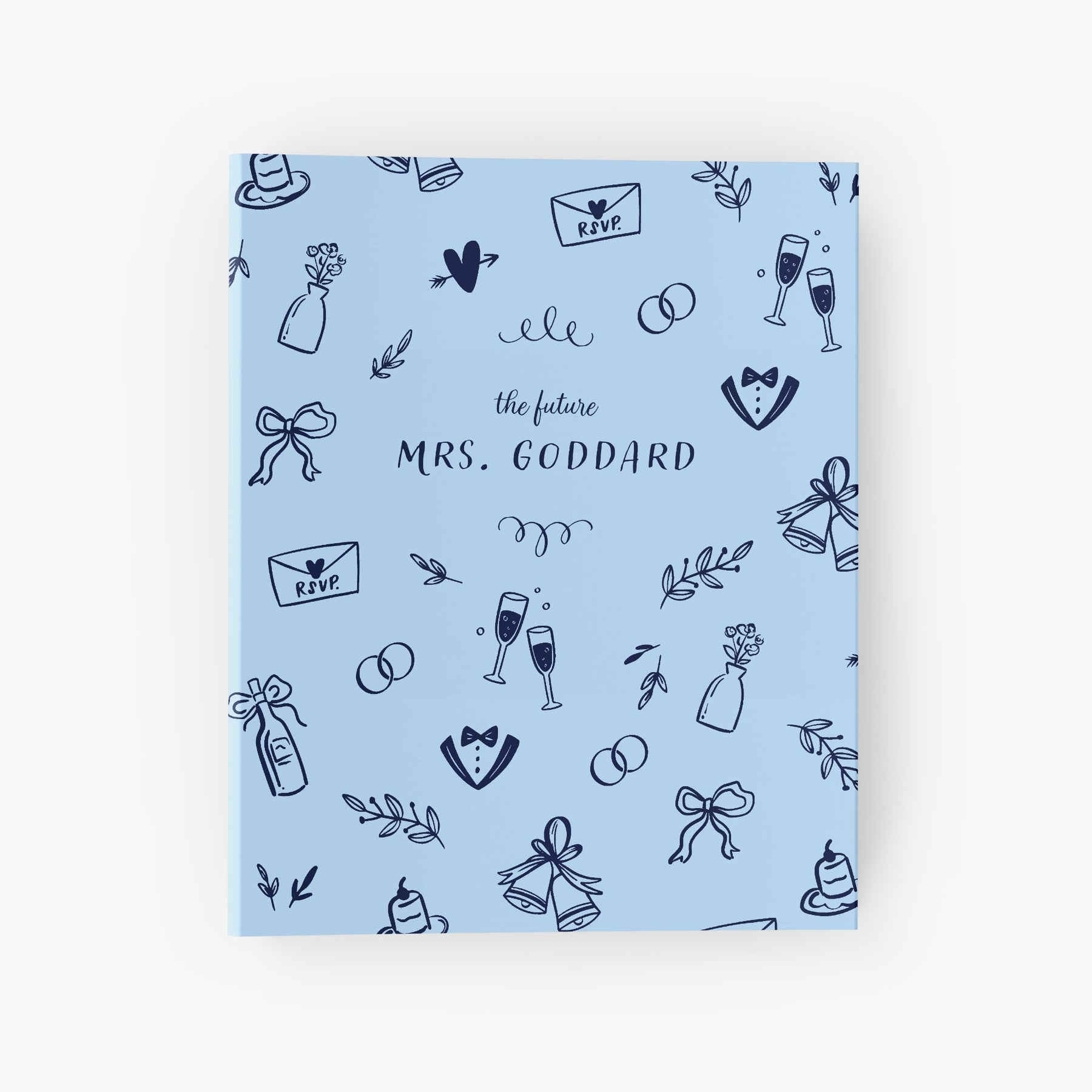 Custom wedding planning binder with whimsical hand-drawn doodles personalized with "The Future Mrs."