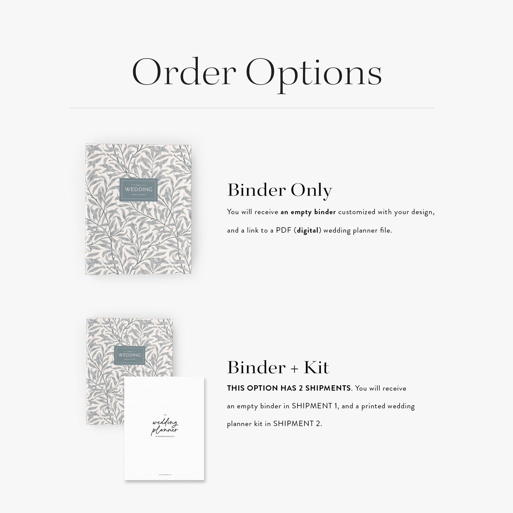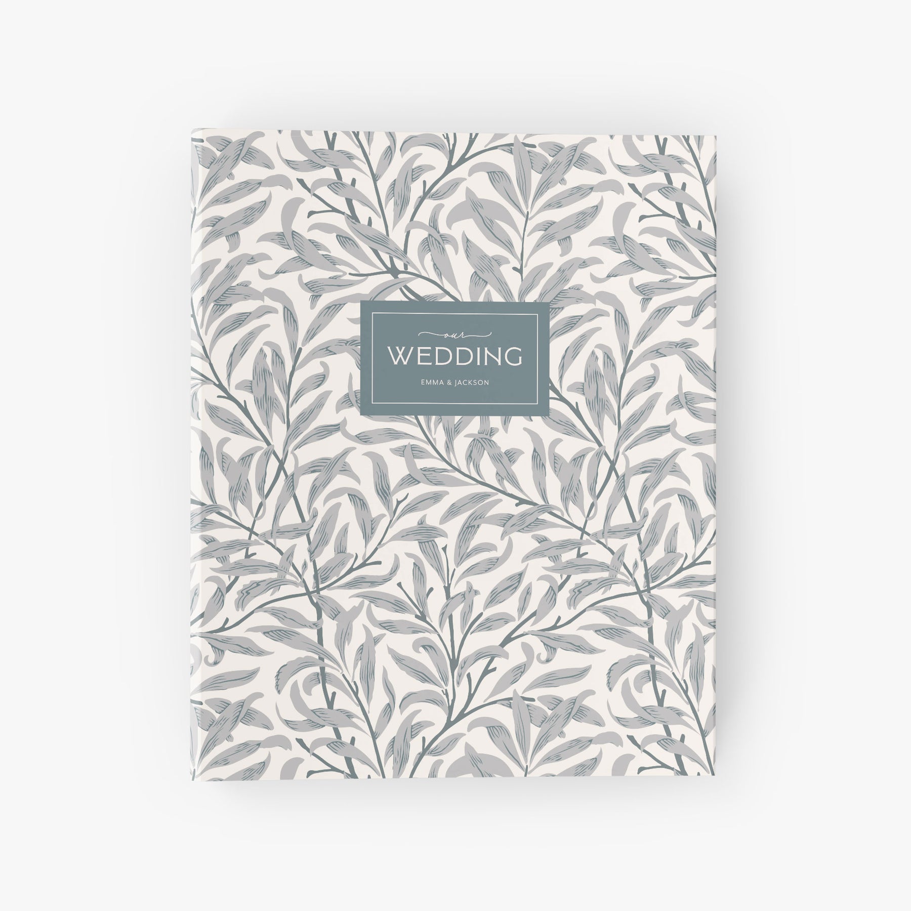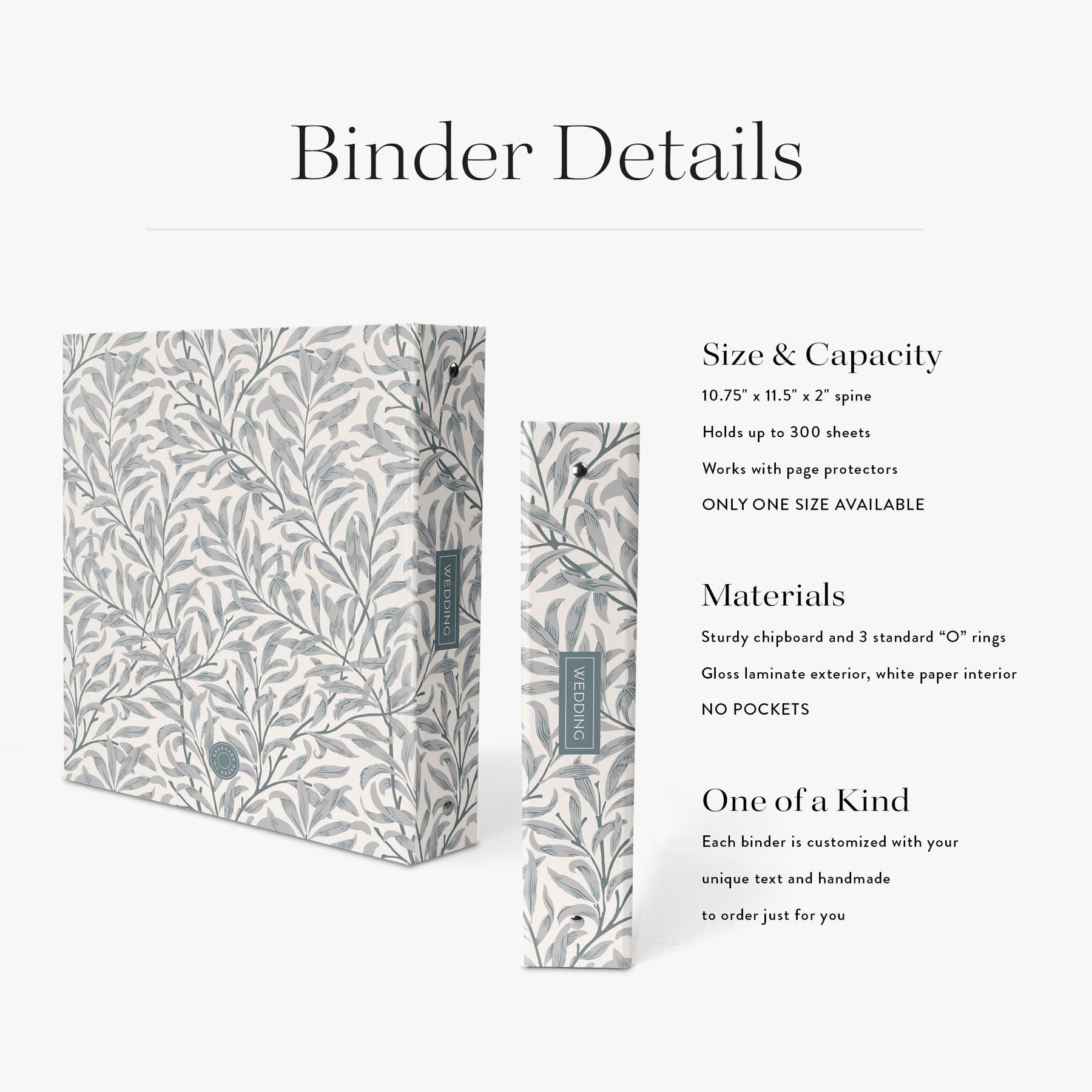 Custom wedding planning binder features silvery-blue willow leaf patterned inspired by William Morris personalized with your names