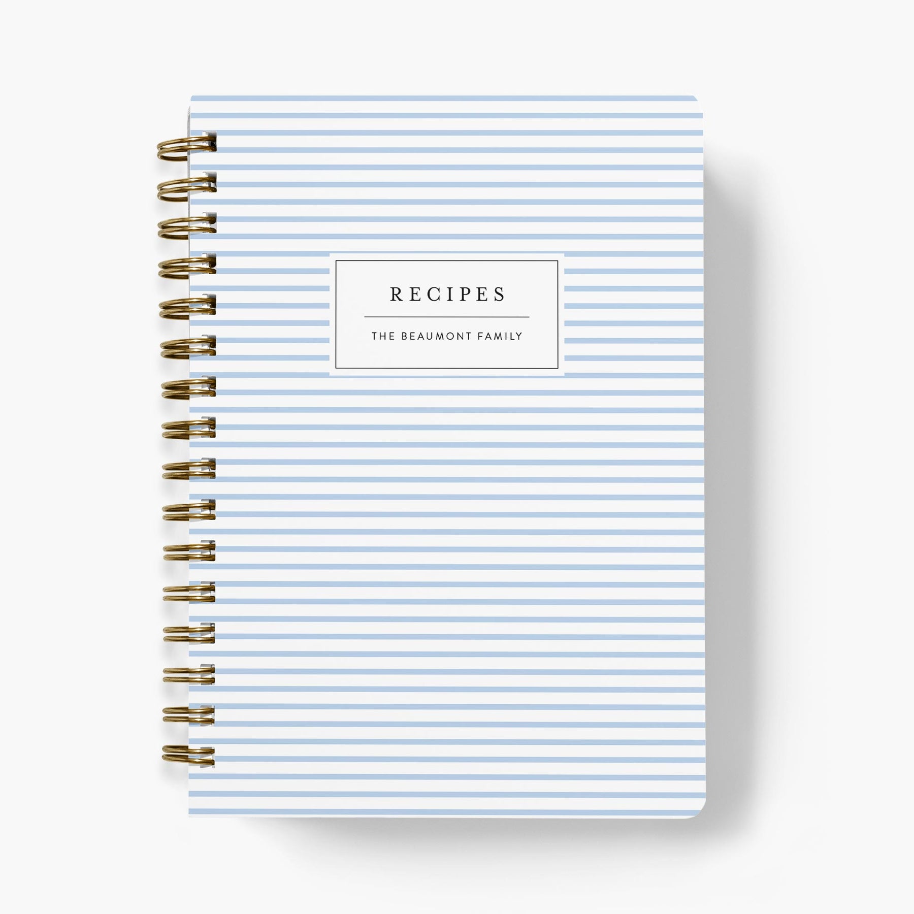 Personalized recipe notebook with striped cover and gold spiral binding on a white background